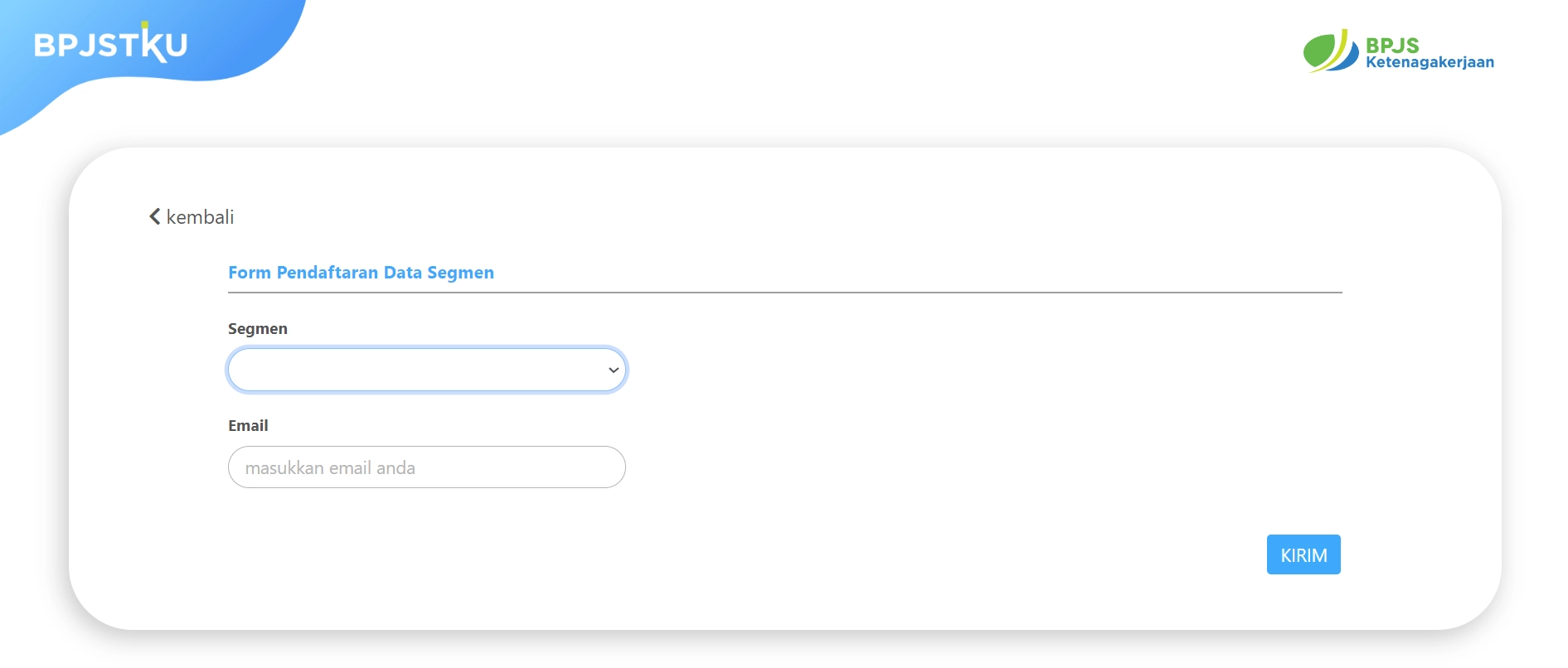 1. Di halaman utama situs, buat akun BPJSTKU dengan memasukkan email dan segmen. Segmen yang dimaksud di sini adalah segmen pekerja, apakah Penerima Upah (PU), Pekerja Bukan Penerima Upah (BPU), atau Pekerja Migran Indonesia (PMI).