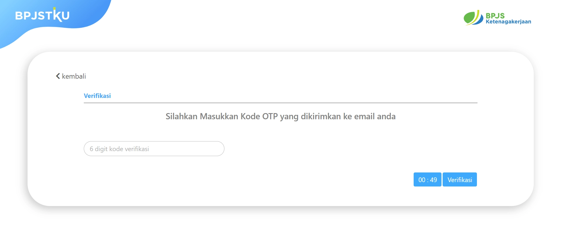 1. Situs BPJSTKU akan mengirimkan kode OTP melalui email yang didaftarkan. Masukkan kode OTP tersebut di kolom yang tersedia.