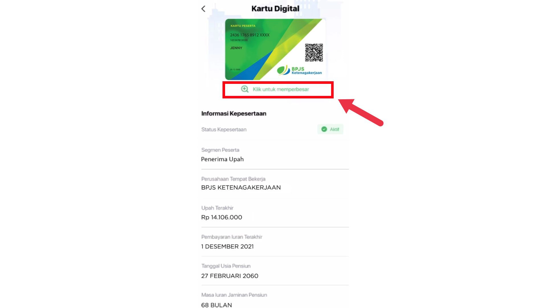 1. Di paling atas, akan muncul gambar kartu digital, diikuti dengan detail informasi kepesertaan. Di bawah kartu, kamu bisa pilih opsi “Klik untuk memperbesar”.